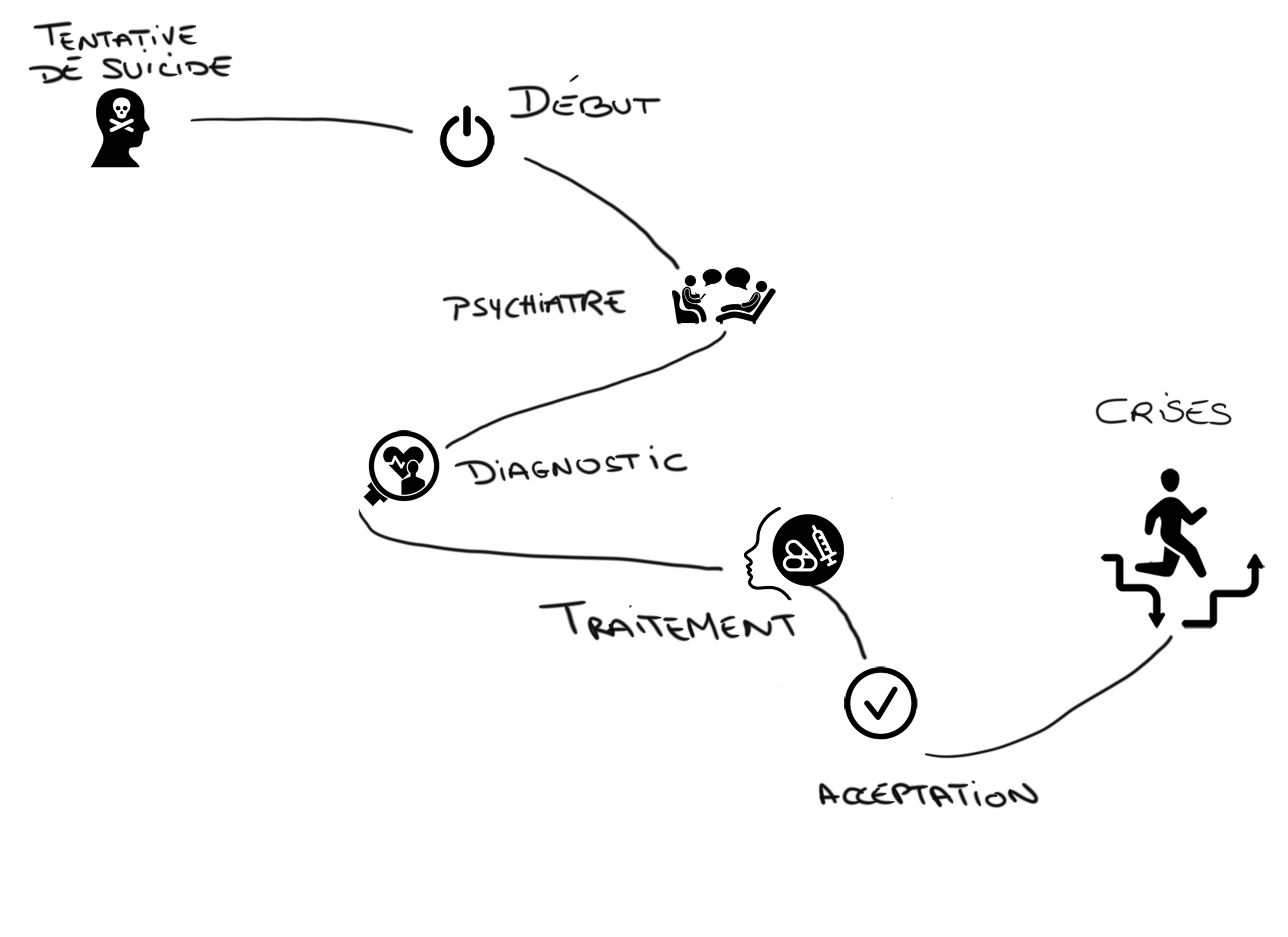 Tout a commencé à mes 16 ans, le moment où mon frère m’a retrouvé inconsciente et que j’ai été transféré aux urgences. S’en est suivi, ma première hospitalisation dans un service d’adultes. Le choc de ma vie, pour moi, je n’étais pas comme les autres patients, la plupart schizophrène, quelques dépressifs mais beaucoup plus vieux. Je ne pouvais pas me sentir plus seule qu’à ce moment là, découvrant la maladie mentale dans sa forme la plus crue . J’étais enfermée, seule ado parmi une vingtaine de personnes et pendant une semaine, je n’ai pas eu de visites ou d’appels autorisés. Mon séjour s’est résumé à parler à des psychiatres, des psychologues et à l’équipe soignante, le diagnostic qu’ils ont posé était « Episode Dépressif Majeur » et mon premier traitement, le deroxat, le voyage pouvait commencer. Un périple, long, fastidieux avec beaucoup de roller coaster et de « on repart à zéro ».