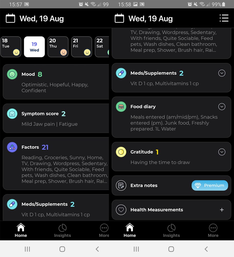 J’ai une application sur mon téléphone bearable (je vous montre un exemple ci-contre) qui m’aide à tracer ma journée et peut m’aider à voir les oublis, la fluctuation de mes humeurs (etc) et surtout leurs persistances, cette application permet de mettre un peu d’objectivité (mais il faut être honnête ce qui peut être dur) et une journée qui se passe moins bien que prévu n’est PAS un signe de rechute ou d’échec, encore une fois, c’est la persistance des symptômes qui indiquent que quelque chose cloche.